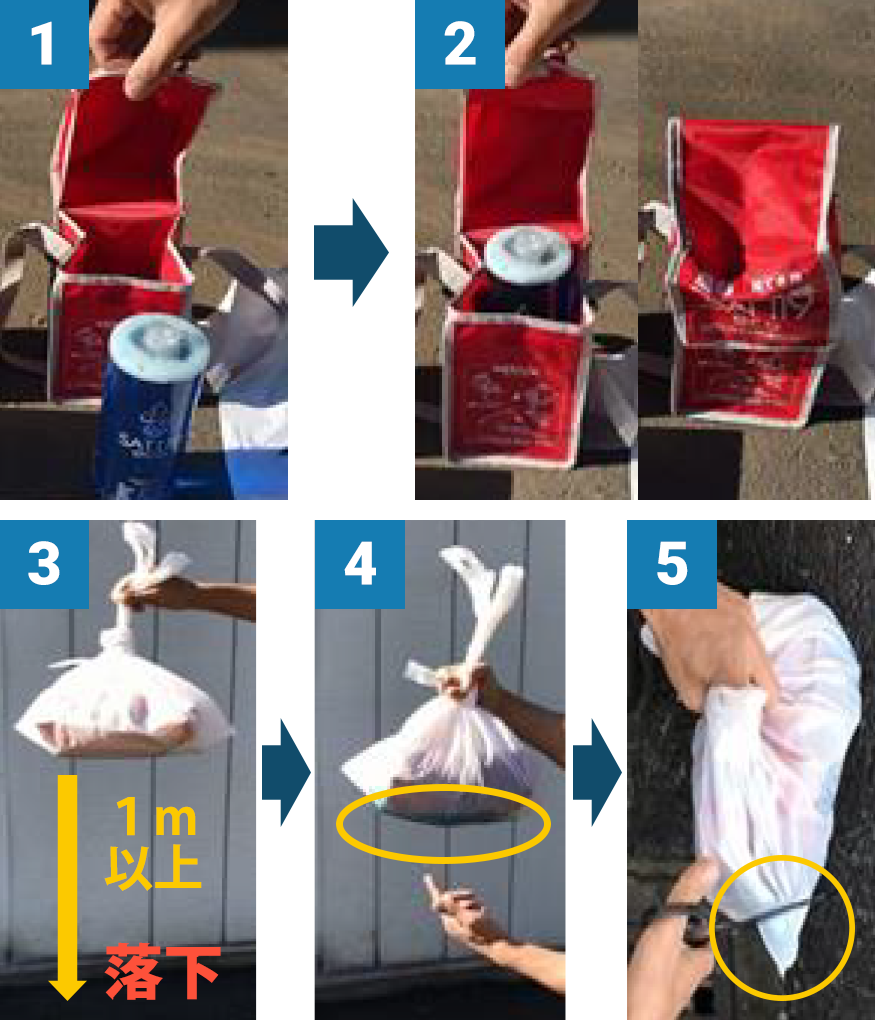 - 上記②をビニール袋の中に入れて、口を縛り1m以上の高さから落下させます。