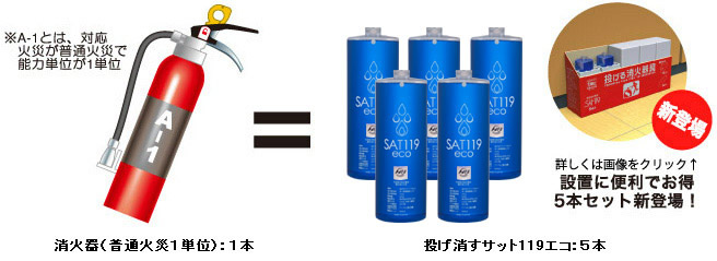 「投げ消すサット119エコ」5本で「普通火災対応1単位(A-1)の消火器」と同等の消火能力を有します。簡易消火用具として義務設置の消火器を消火能力単位で1/2まで置き換える事が可能です。