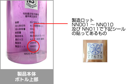 お買い上げいただいた製品の製造ロット番号をご確認いただき、下記の製造ロット番号の製品は品質保証期限の5年間を既に経過しておりますので、液漏れ等の不具合が生じることがございます。